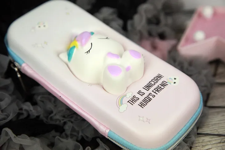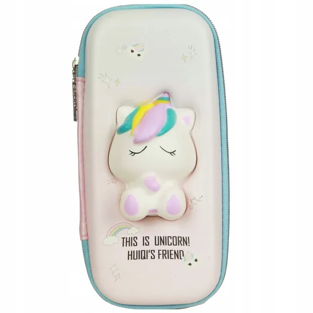 Piórnik w pięknej, bajkowej kolorystyce. Na przodzie uroczy unicorn squishy.