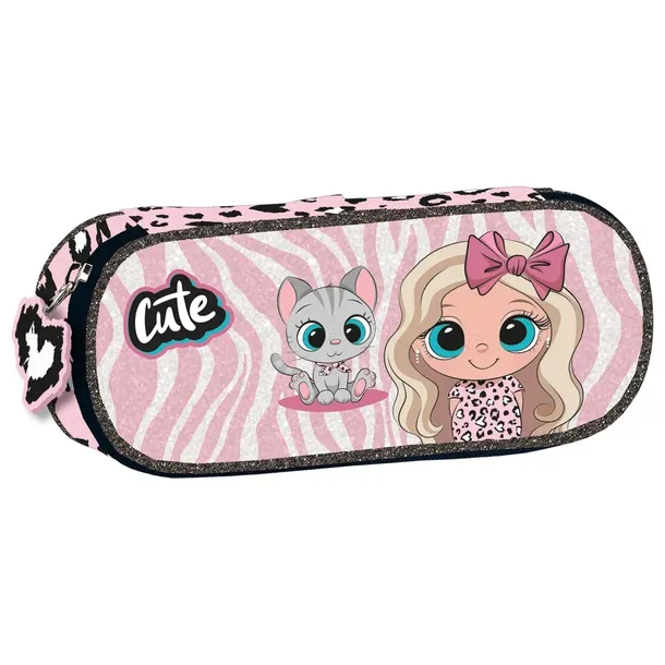 Jednokomorowy usztywniany piórnik zapinany na zamek z ozdobną zawieszką, którego wnętrze całkowicie wykończone jest podszewką. Wewnętrzna klapka posiada gumkę na 5 sztuk przyborów do pisania, dodatkowo w piórniku znajduje się klapka z gumką na 4 sztuki przyborów oraz kieszonką z siateczki zapinaną na zamek.