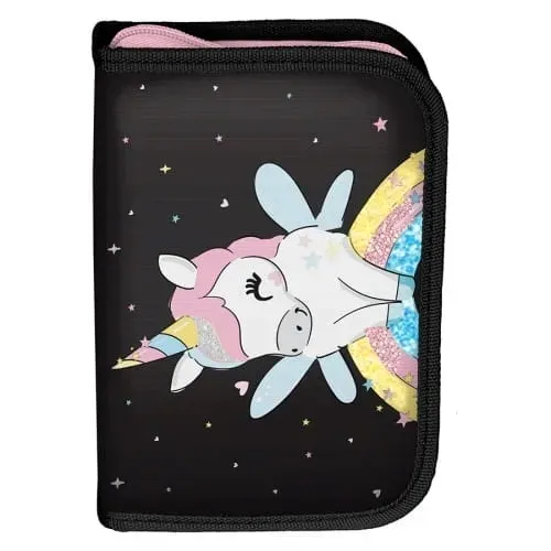 Piórnik bez wyposażenia, w środku klapka z uchwytami na przybory piśmiennicze.