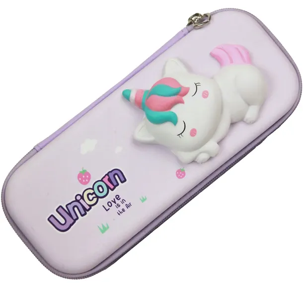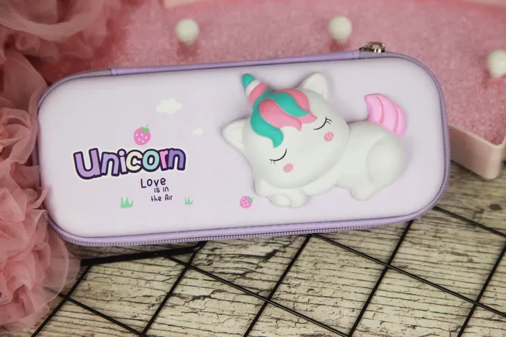 Piórnik w pięknej, bajkowej kolorystyce. Na przodzie uroczy unicorn squishy.