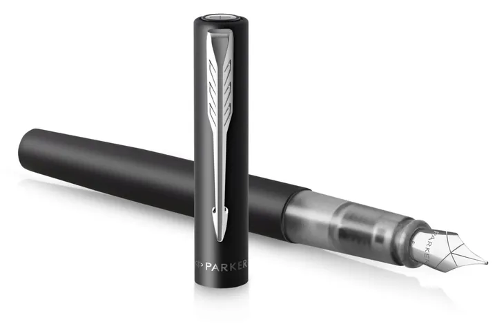 Posiada metaliczne wykończenie w satynowym czarnym kolorze uzupełnione chromowanymi wykończeniami i charakterystycznym klipsem w kształcie strzałki PARKER. Pióro wieczne Vector XL posiada dużą, trwałą stalówkę ze stali szlachetnej, która zapewnia wygodne i płynne pisanie.