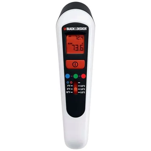 Pirometr marki BLACK&DECKER służy do wyszukiwania nieszczelności w izolacji w obrębie domu i mieszkania, aby zmniejszyć koszty zużycia energii. Identyfikuje zarówno ciepłe, jak i zimne ciągi powietrza względem ustawionej temperatury odniesienia. Ułatwia monitorowanie szczelności pomieszczeń i gospodarowanie energią.