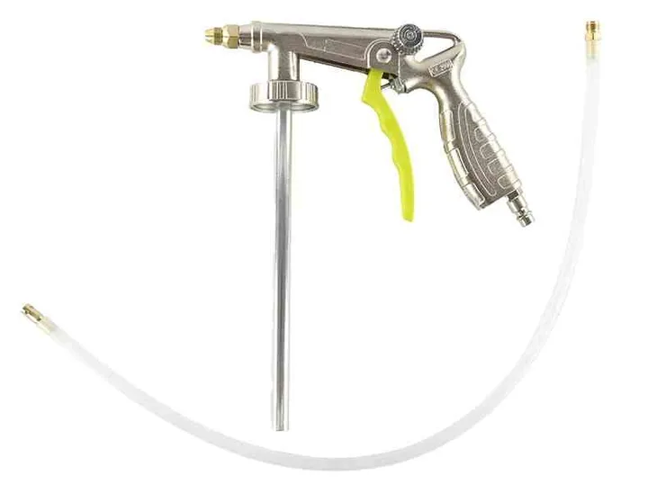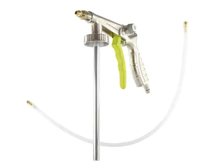 Dzięki dołączonemu plastikowemu wężykowi, można dotrzeć do trudno dostępnych miejsc, co sprawia, że aplikacja środków jest bardziej precyzyjna i skuteczna. Specyfikacja techniczna pistoletu obejmuje ciśnienie robocze na poziomie 6 bar / 90 psi oraz przyłącze 1/4", zapewniając jednocześnie bezpieczeństwo i wygodę użytkowania. Dodatkowe funkcje to: