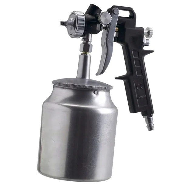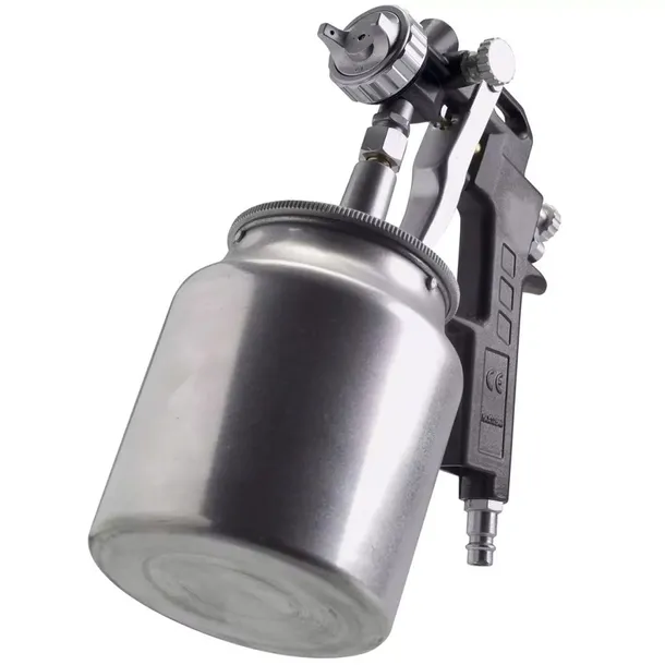 Pistolet lakierniczy działa w połączeniu ze sprężarką powietrza i szczególnie nadaje się do malowania natryskowego różnych materiałów, między innymi, metalowych elementów nadwozia samochodowego, ogrodzeń oraz elewacji budynków. Dolny zbiornik ma pojemność 750 ml i łatwo go napełnić.