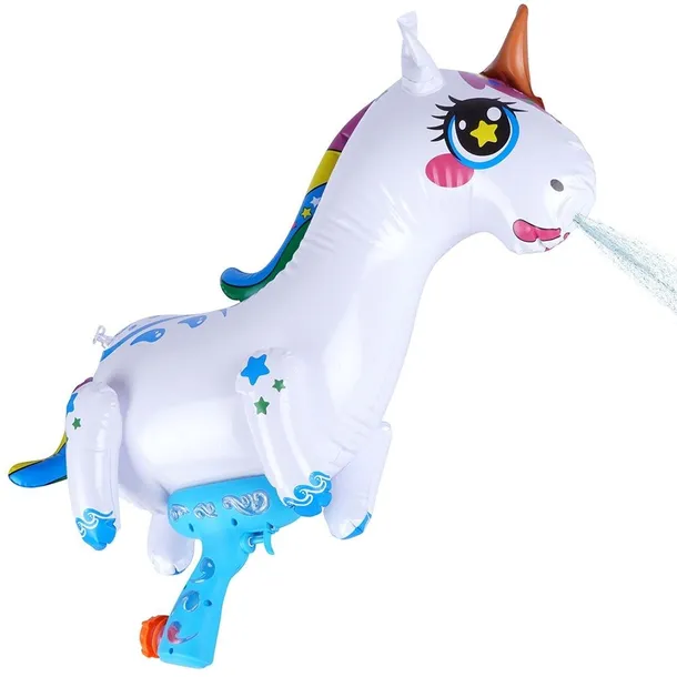 ✅ ŚWIETNA ZABAWA - Nadmuchiwany pistolet na wodę w kształcie jednorożca, idealny do zabawy w wodzie i na świeżym powietrzu. W skład zestawu wchodzi: pistolet oraz pompka. Pistolet ma wymiary 55 x 18 x 58 cm.