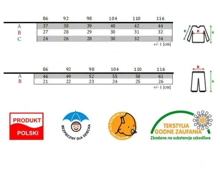 Piżamki polskiej produkcji, wykonane są w 100% z miękkiej, miłej w dotyku, dzianiny dwułożyskowej bawełnianej o wysokiej gramaturze. Wszystkie materiały posiadają certyfikat ekologiczny Oeko-TEX(r) Standard 100, Class1 (najwyższa klasa, produkty są bezpieczne dla dzieci).