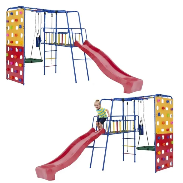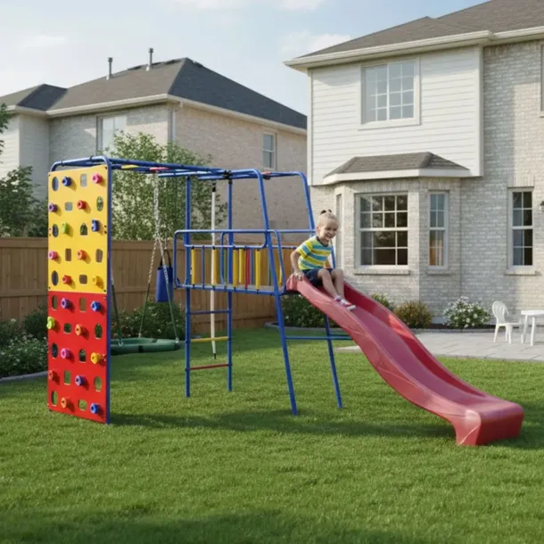 Plac zabaw do ogrodu Tęcza – wielofunkcyjny zestaw gimnastyczny o solidnej metalowej konstrukcji. Posiada zestaw dodatkowych akcesoriów, takich jak kółka gimnastyczne, worek bokserski, drabinka pozioma czy ścianka wspinaczkowa, które dopełniają ten ogrodowy plac zabaw i zapewniają mu dodatkowe funkcje. Oprócz wielu walorów użytkowych ten plac zabaw w ogrodzie jest jednocześnie niezwykle atrakcyjny. Posiada nowoczesne elementy w żywych kolorach, które od razu przyciągają wzrok – nie tylko dzieci, ale i dorosłych.