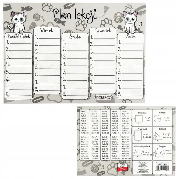 Plan lekcji dla ucznia o ciekawej grafice w formacie A5. Zawiera miejsce do samodzielnego uzupełnienia na pięć dni zajęć szkolnych. Z tyłu tabliczka mnożenia oraz podstawowe wzory matematyczne. Zapakowany w opakowanie zbiorcze - folię po 25szt.