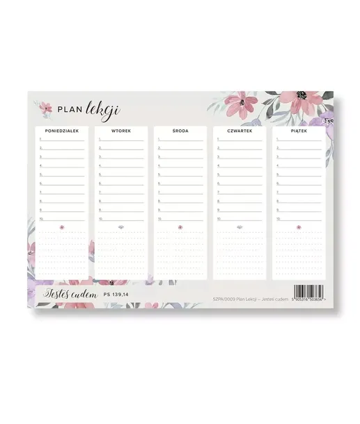 Pozwól, aby chrześcijański plan lekcji „Jesteś Cudem” dodał Ci inspiracji i organizacji na każdy dzień tygodnia. Wykonany z najwyższej jakości kartonu o gramaturze 250 g, ten plan lekcji jest nie tylko trwały, ale również niezwykle estetyczny. Plan lekcji ma format A5. Delikatne, pastelowe kwiaty, które zdobią ten plan, wprowadzają uśmiech do codziennego życia. Na dole widnieje fragment Psalmu 139,14 „Jesteś cudem”, który przypomina o wyjątkowości każdego człowieka i Bożej miłości. To doskonały wybór dla osób, które pragną czerpać inspirację z Pisma Świętego, jednocześnie utrzymując swoje codzienne obowiązki w porządku.