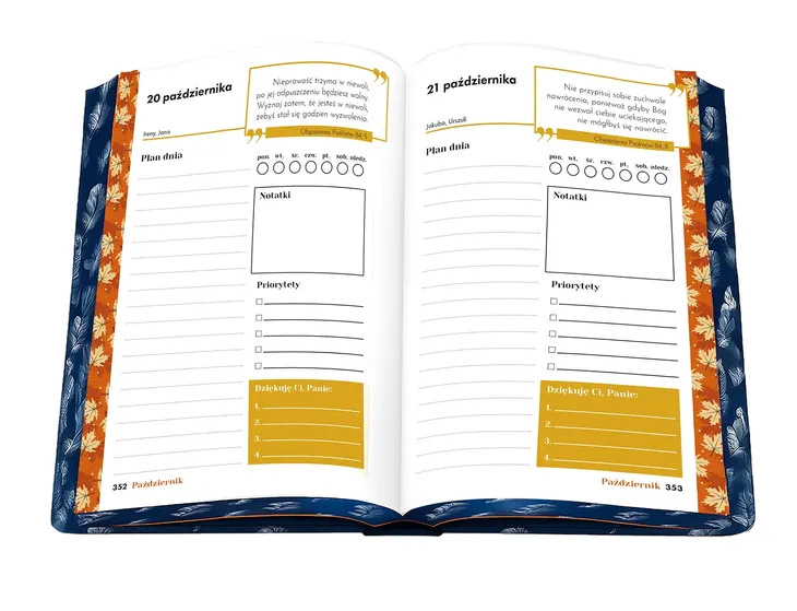 Wyjątkowy Planer inspirowany myślami św. Augustyna Oddajemy w ręce Czytelników wyjątkowy Planer inspirowany myślami św. Augustyna – jednego z największych mistrzów duchowości chrześcijańskiej. Dlaczego właśnie św. Augustyn? Pierwszą i najważniejszą inspiracją była niezwykła historia życia samego świętego z Hippony, człowieka, który przeszedł długą drogę, zanim odnalazł Boga; drugą – wybór na papieża augustianina, kard. Roberta Prevosta. Święty Augustyn sformułował jedną z najbardziej znanych koncepcji pojmowania czasu. Wierzymy, że to doświadczenie św. Augustyna może być doskonałym drogowskazem na każdy dzień, ponieważ ma najlepszy punkt odniesienia, a jest nim Bóg. Mamy więc nadzieję, że niniejszy planer pomoże te priorytety wyznaczać również Tobie – w Twojej codzienności. W planerze znajdziesz: • inspirujące i motywujące myśli św. Augustyna ma każdy miesiąc i dzień, • miejsce na priorytety, własne notatki oraz refleksje, • dziennik wdzięczności, który pomaga zobaczyć dobro w naszym życiu, • piękną szatę graficzną, na każdy miesiąc inną. Pracę z planerem można rozpocząć w każdej chwili. Nie jest on stworzony tylko na dany rok kalendarzowy. Każdy decyduje kiedy zacznie z nim współpracę. Wiemy, że początek roku jest zawsze dobrym punktem startowym więc polecamy zacząć planować swoją codzienność już od stycznia. Zapraszamy Cię do tego, abyś budował ten planer jako swój własny. Mamy nadzieję, że pomoże Ci on odkrywać Boga w codzienności!
