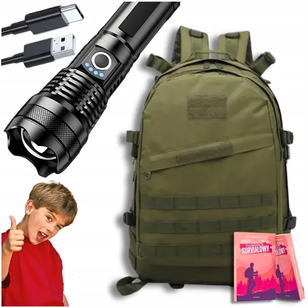 WOJSKOWY PLECAK TURYSTYCZNY ZIELONY 30L + LATARKA CZARNA MOCNA LED USB