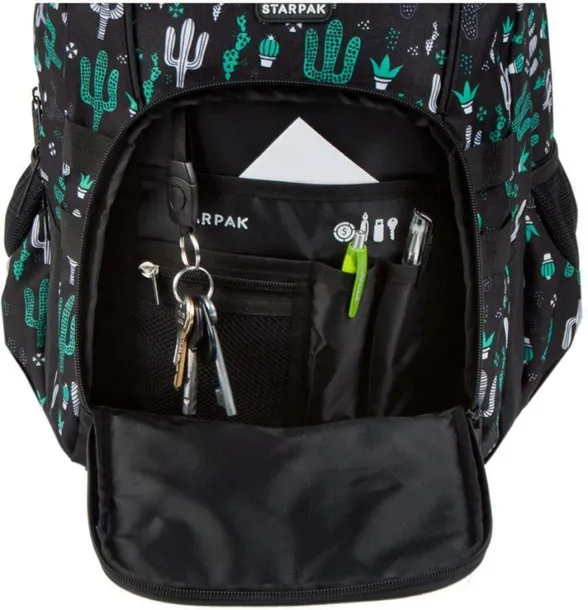 Plecak młodzieżowy Cactus składa się z jednej obszernej komory zapinanej na zamek i trzech przednich kieszeni w tym jednej z organizerem. Po bokach posiada kieszenie z siateczki na napój z dodatkowym zabezpieczeniem w postaci zapinanych pasków. Wewnątrz plecaka znajduje się kieszeń na laptop. Usztywniane plecy i mocne ramiona zostały wyściełane gąbką, dopasowują się do pleców i zapewniają komfort noszenia. Wymiary: 43,5 x 30 x 20 cm.