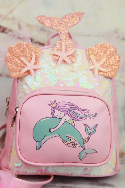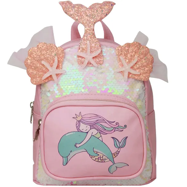 Piękny, cekinowy plecaczek z motywem syrenki w kolorze różu. Efektowny ogon i muszelki 3D pokryte brokatem. Plecak z przodu posiada jedną kieszeń na drobiazgi, na której widnieje uroczy nadruk syrenki oraz delfinka.