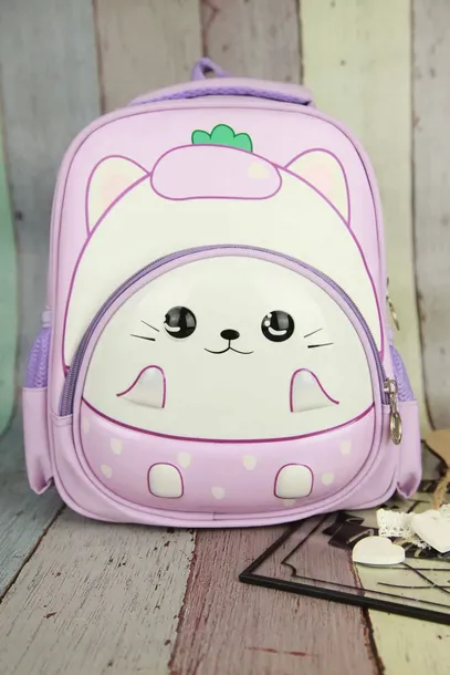 Piękny plecaczek w odcieniach fioletu. Plecak z przodu posiada sztywną kieszeń na drobiazgi, na której jest nadruk 3D.