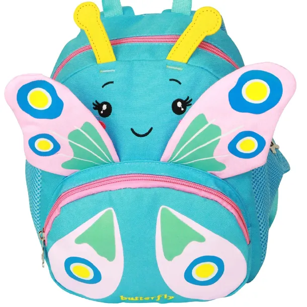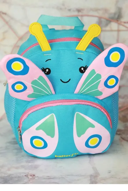 Piękny plecaczek z motywem motyla w kolorze niebieskim. Skrzydła oraz czułki motyla są 3D. Plecak z przodu posiada jedną kieszeń na drobiazgi oraz dwie po bokach, idealne na napoje.