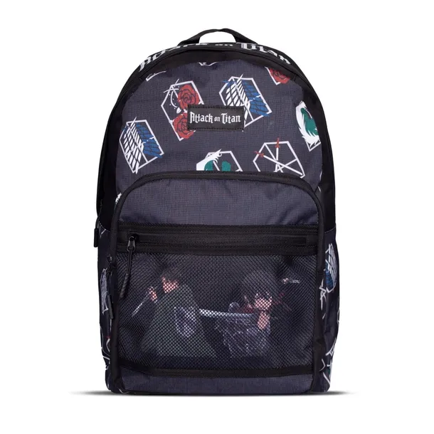 Pojemny plecak jednokomorowy dla fanek i fanów "Ataku Tytanów", ozdobiony w przyciągające wzrok herby korpusu zwiadowców, żandarmerii, stacjonarnego oraz treningowego.