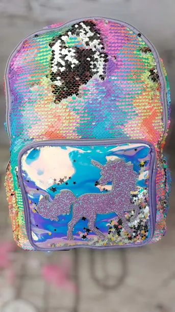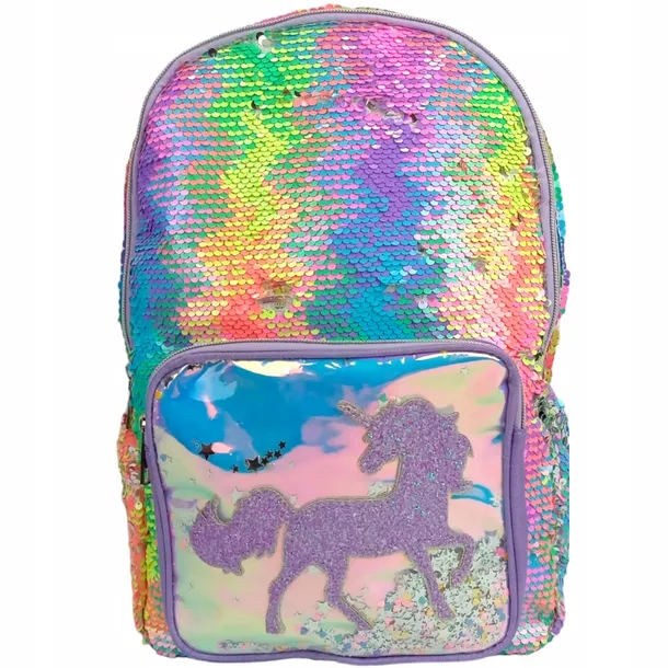 Oryginalna kieszonka z przodu na której znajduje się mieniący jednorożec w kolorze fioletowym. Pod przezroczystą kieszonką masa kolorowych, błyszczących cekinów. Po bokach kieszonki na napoje. W środku kieszonka na drobiazgi, zasuwana na suwak. Szelki regulowane, tył lekko usztywniany.