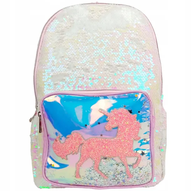 Oryginalna kieszonka z przodu na której znajduje się mieniący jednorożec w kolorze różowym. Pod przezroczystą kieszonką masa kolorowych, błyszczących cekinów. Po bokach kieszonki na napoje. W środku kieszonka na drobiazgi, zasuwana na suwak. Szelki regulowane, tył lekko usztywniany.