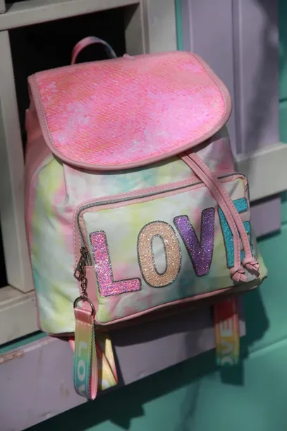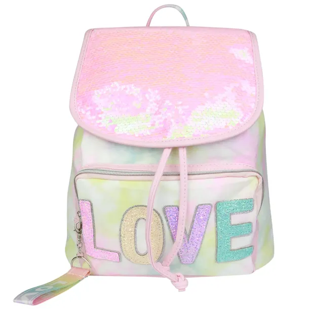 Wyżej wspomniana klapa jest wyszyta pięknie mieniącymi różowymi cekinami. Na przedniej kieszeni plecaka urzekający napis LOVE wykonany z błyszczących drobinek, które niesamowicie odbijają światło! Kieszeń zasuwana na zamek błyskawiczny.