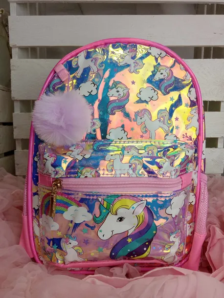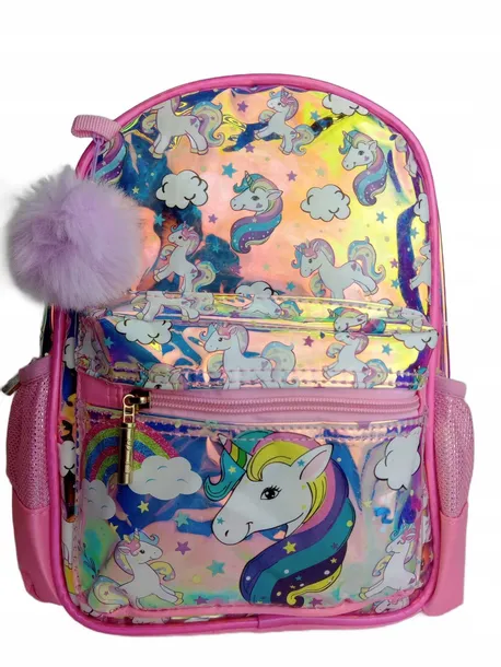 Piękny plecak holo, zdobiony słodkimi jednorożcami. Na górze plecaka fioletowa przywieszka- puszek. Na przodzie pojemna kieszonka na suwak. Po bokach mieniące kieszonki z gumką. Szelki plecaka są regulowane. Plecak idealny do przedszkola, na wycieczki.