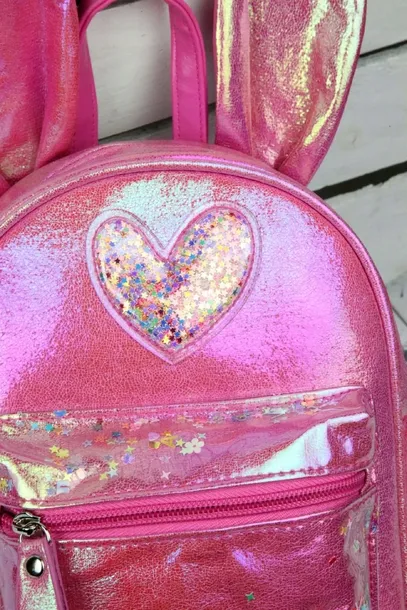 Cudowny plecaczek wykonany z niezwykłą starannością i dbałością o każdy detal z pięknego opalizującego tworzywa. Piękna kolorystyka oraz oryginalne uszy królika przyciągną wzrok każdej małej księżniczki. Plecak z przodu posiada kieszonkę pokrytą transparentnym tworzywem, która dodatkowo posiada cudne drobinki, nad kieszonką znajduje się serduszko również wypełnione kolorowymi drobinkami . Szelki plecaka są regulowane a cały tył wykonany jest z ekoskórki. Plecak zasuwany na suwak, który posiada wygodne uchwyty, idealne dla każdego dzieciaka, środek obszyty jest podszewką a w nim znajduję się dodatkowo mała kieszonka. Pięknie błyszczący zachwyci każdego!