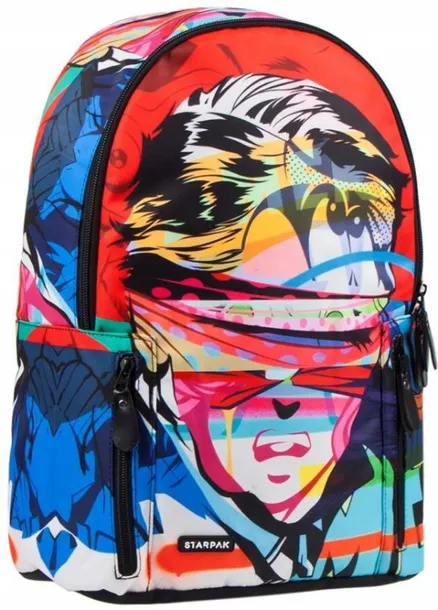 Kolorowy, inspirowany street artem i graffiti plecak z pewnością przypadnie do gustu młodzieży, która w odważny sposób lubi wyrażać swój styl. Plecak posiada jedną dużą komorę zamykaną na zamek, wewnątrz której znajduje się organizer i kieszeń na laptop. Na zewnątrz plecaka umieszczone zostały dwie kieszonki, które pomieszczą podręczne drobiazgi. Z takim plecakiem żaden nastolatek nie pozostanie niezauważony!
