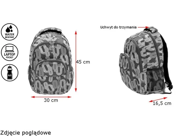 - Plecak został wykonany z wysoko jakościowego materiału tzw. poliestru, który pod wpływem wody nie skurczy się i nie będzie się gniótł.