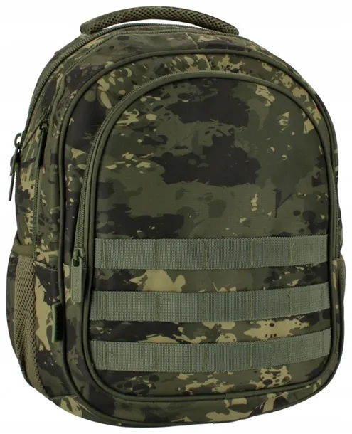 Plecak składa się z 1 dużej komory i 2 obszernych przednich kieszeni, w środku komór znajdują się organizery, 2 boczne wzmocnione kieszenie siatkowe na butelkę z napojem, wytrzymałe zamki błyskawiczne, plecak wykonany z mocnego materiału poliestrowego 600D specjalnie powlekanego wodoodporną warstwą, ergonomiczne plecy i szelki ,plecy z systemem wentylacji dla większego komfortu, grube, miękkie szelki chronią ramiona, regulowane szelki pozwalają dopasować plecak do wzrostu i budowy ciała, uchwyt w środku usztywniony, pozwalając zawiesić plecak na wieszaku lub wygodnie nosić go w ręce. Plecak w zielonych moro kolorach. Wygodny i funkcjonalny plecak szkolny młodzieżowy STARPAK z grafiką z serii Tactic. Użytkowanie takiego plecaka to czysta przyjemność.