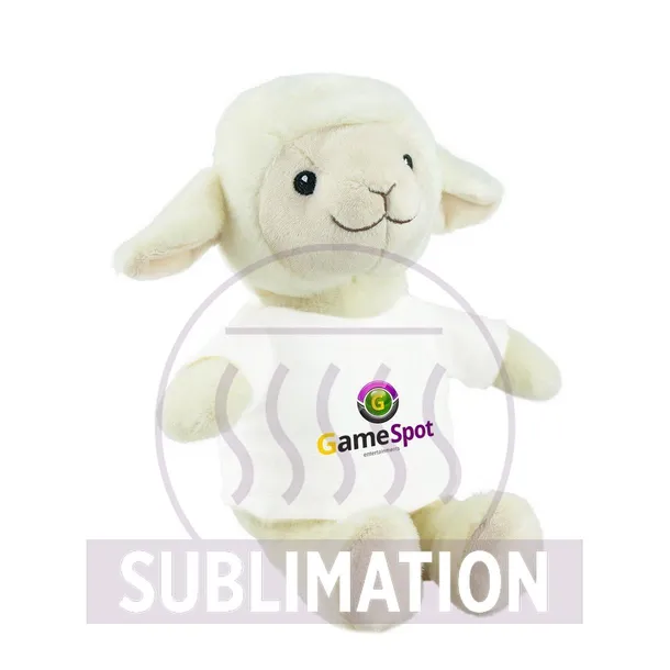 Owca z białą koszulką pod nadruk (koszulka pakowana oddzielnie), wykonana z pluszu pochodzącego z poddanych recyklingowi butelek PET, posiada certyfikat GRS (Global RecycIed Standard)