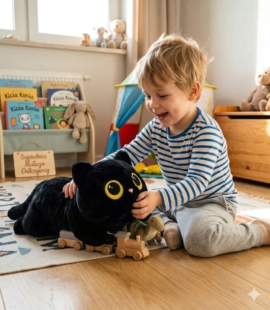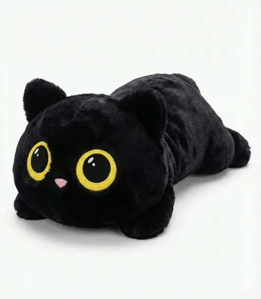 Poznaj uroczego, czarnego kotka o głębokim spojrzeniu żółtych oczu. To nie tylko maskotka, to idealny towarzysz do przytulania, zabawy i stylowa ozdoba każdego wnętrza.