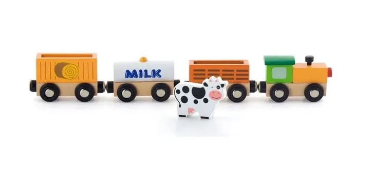 Lokomotywa ciągnie za sobą trzy wagoniki: jeden ze słomą, drugi z mlekiem i trzeci z krową. Oczywiście po przewiezieniu na farmę krowę można wysadzić i zostawić w nowym gospodarstwie.
