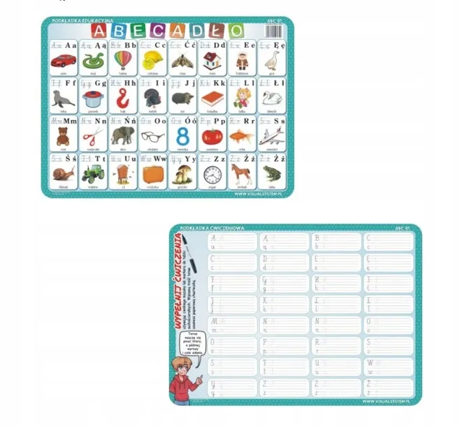 edukacyjna podkładka ćwiczeniowa Visual Systemdo samodzielnychćwiczeńwypełniać cienkim mazakiem lub markerem do tablicsuchościeralnychtreść można zmazać papierową chusteczkądwustronniefoliowanadrukowana na kredzie 350 g