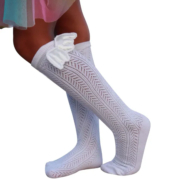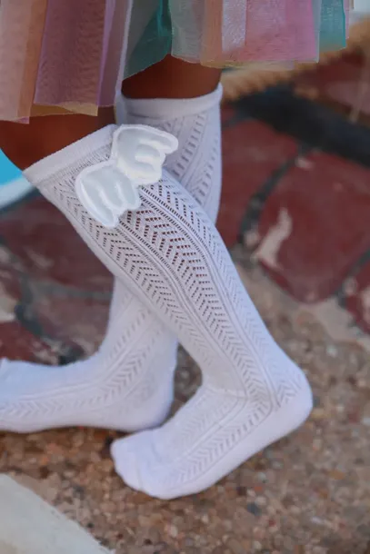 Przepiękne, delikatne ażurkowe podkolanówki w kolorze bieli. Szczególnego uroku i unikatowości dodają delkatne skrzydełka.