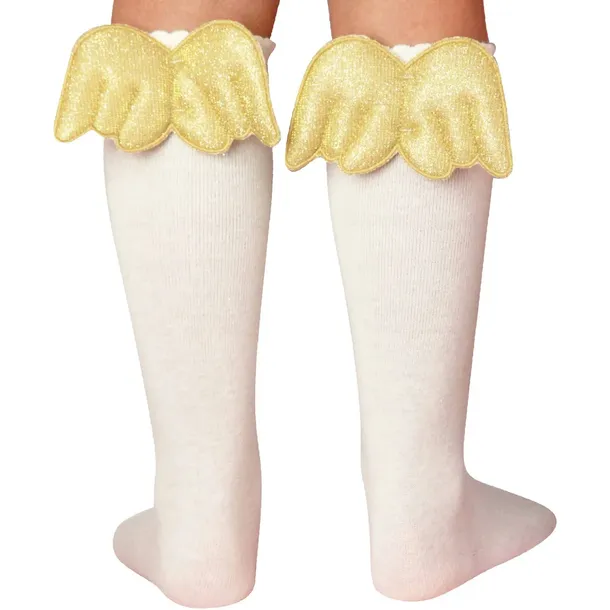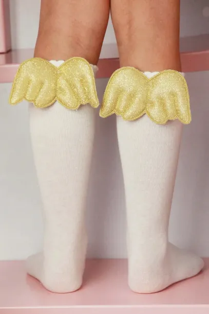 Przepiękne podkolanówki w kolorze ecru. Szczególnego uroku i unikatowości dodają delikatne złote skrzydełka, które pięknie się mienią.
