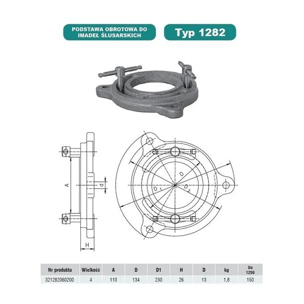 Podstawa obrotowa typ 1282-4 o konstrukcji żeliwnej jest przeznaczona do imadła ślusarskiego Bison-Bial 1250-150. Brudna.