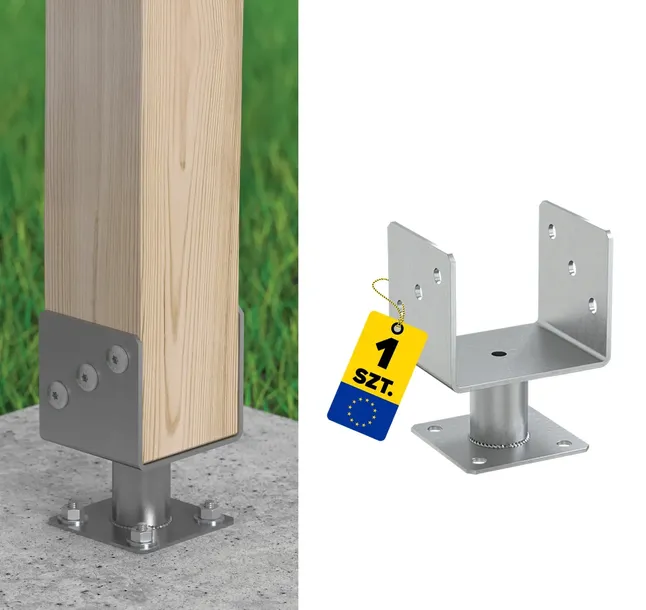 Podstawa słupa PMFU typu „U” umożliwia stabilny montaż elementów drewnianych z betonem, zapewniając solidne połączenie nawet dla słupów o dużym ciężarze. Wykonana z wytrzymałej stali S235, zabezpieczona malowaniem proszkowym, gwarantuje wysoką odporność na korozję. Dzięki zwartej konstrukcji i precyzyjnym mocowaniom jest idealnym rozwiązaniem do trwałych konstrukcji zewnętrznych.