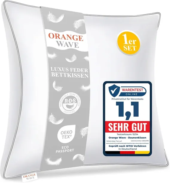 Orange Wave Poduszka z pierza 80 x 80 cm – 3-komorowa poduszka puchowa 40 x 80 cm, poduszka puchowa i pierza, ergonomiczna poduszka do spania RDS i Öko-Tex. Podwójne połączenie miękkości