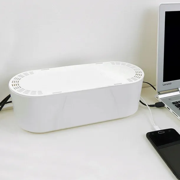 ✅ BEZPIECZNY - Pojemnik posiada otwory oraz wywietrzniki w pokrywie, które zapewnią odpowiedni dopływ powietrza do przechowywanych kabli. Dodatkowo otwory po bokach umożliwią właściwe poprowadzenie kabli.