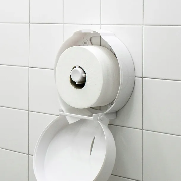 Klasyczny dozownik na papier toaletowy koloru białego. Wykonany z plastiku ABS (dobra odporność na zarysowania). Wizjer pozwala na kontrolę poziomu wkładu. Posiada specjalny grzebień, który ułatwia dozowanie i odrywanie papieru. Pasują do niego standardowe roli papieru toaletowego jumbo.