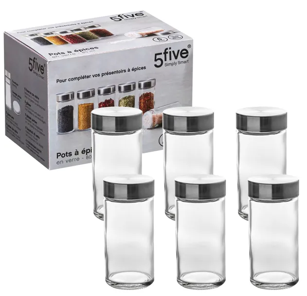 ⚠️ Ofertą sprzedaży jest Komplet 6 szklanych przyprawników Zestaw 6 słoiczków na przyprawy, szklane pojemniki ze srebrnymi pokrywami, idealne do kuchni, restauracji, pozostałe produkty widoczne na zdjęciach nie są przedmiotem oferty, nie wchodzą także w skład oferowanego produktu.