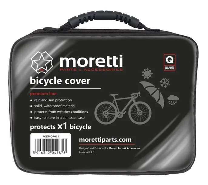 - Wysokiej jakości pokrowiec rowerowy firmy MORETTI wykonany z bardzo trwałego i odpornego na wszelkie czynniki atmosferyczne materiału. W komplecie etui na pokrowiec. Wykonany w taki sposób, że bez problemu możemy zasłonić cały rower