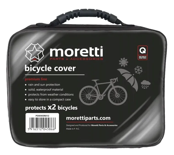 - Wysokiej jakości pokrowiec rowerowy firmy MORETTI wykonany z bardzo trwałego i odpornego na wszelkie czynniki atmosferyczne materiału. W komplecie etui na pokrowiec. Wykonany w taki sposób, że bez problemu możemy zasłonić cały rower