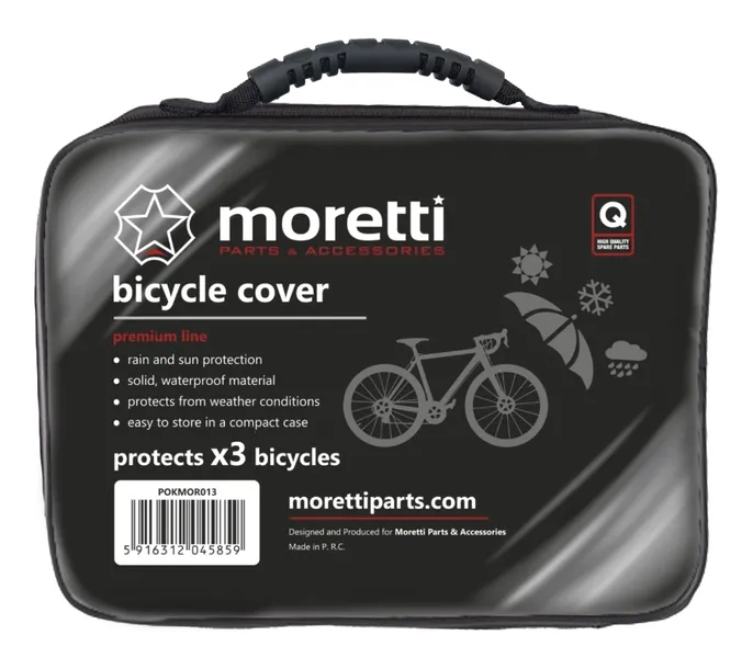 - Wysokiej jakości pokrowiec rowerowy firmy MORETTI wykonany z bardzo trwałego i odpornego na wszelkie czynniki atmosferyczne materiału. W komplecie etui na pokrowiec. Wykonany w taki sposób, że bez problemu możemy zasłonić cały rower