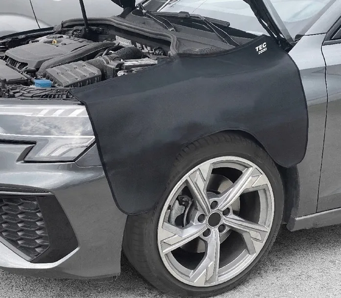 Uniwersalny pokrowiec ochronny wielokrotnego użytku na błotnik, wykonany z ekoskóry.