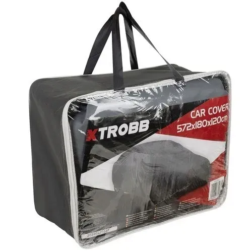 Pokrowiec na samochód zapakowany jest w praktyczną torbę z przezroczystym przodem. Torba ta zamyka się za pomocą dwóch suwaków, a szerokie rączki ułatwiają przenoszenie pokrowca, gdy nie jest używany.