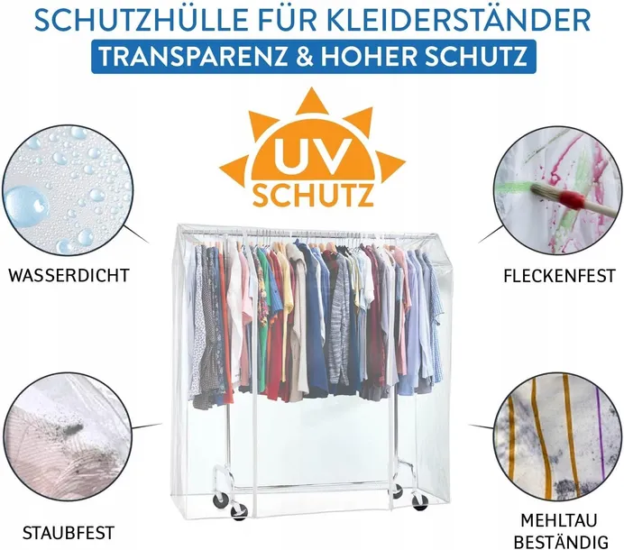 - Bardzo duży rozmiar: Szerokość aż 155 cm sprawia, że pokrowiec pasuje na większość dużych, podwójnych stojaków na ubrania dostępnych na rynku.