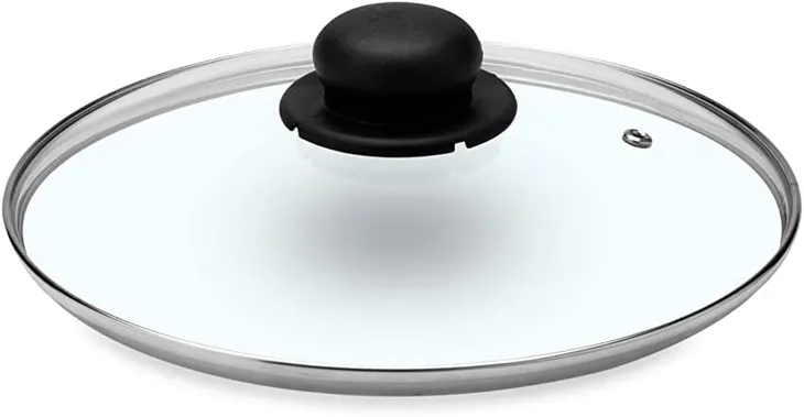 - DOSTĘPNY PRODUKT: Okrągła pokrywka z hartowanego szkła z stalową krawędzią i wentylem oddechowym.
