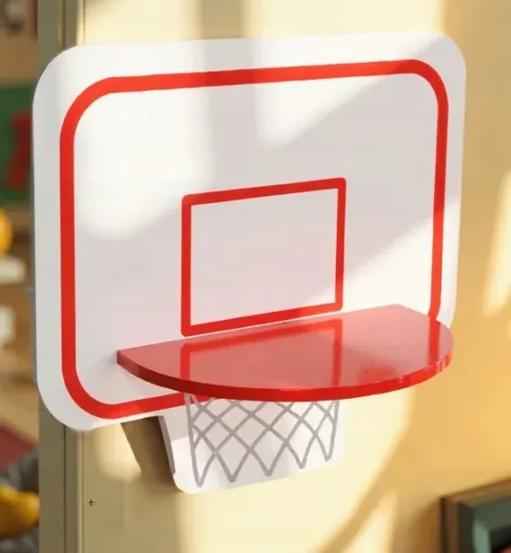 Nietypowa półka ścienna zaprojektowana tak, aby przypominać kosz do koszykówki — świetny pomysł na dekorację wnętrza z charakterem.