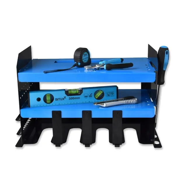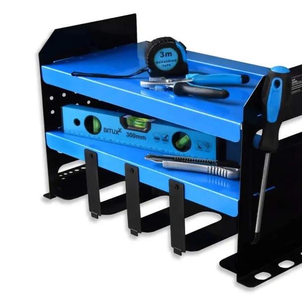 2 półki tworzą przestrzeń do przechowywania i dbają o porządek w miejscu pracy - możesz na nich przechowywać baterie i ładowarki do elektronarzędzi.