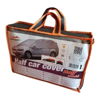 Pokrowiec / pół-plandeka wykonana z trójwarstwowego materiału. Produkt ten idealnie chroni auto przed promieniami UV, śniegiem, deszczem, szronem i innymi czynnikami atmosferycznymi. Sprawdza się również jako ochrona przed nadmiernym nagrzewaniem się wnętrza pojazdu. Mocowany za pomocą gumek zakończonych plastikowymi haczykami, które należy zaczepić o felgi lub kołpaki. Zakładać na zaparkowany pojazd. Bardzo łatwy i szybki w montażu. Zapakowany w saszetkę wielokrotnego użytku.